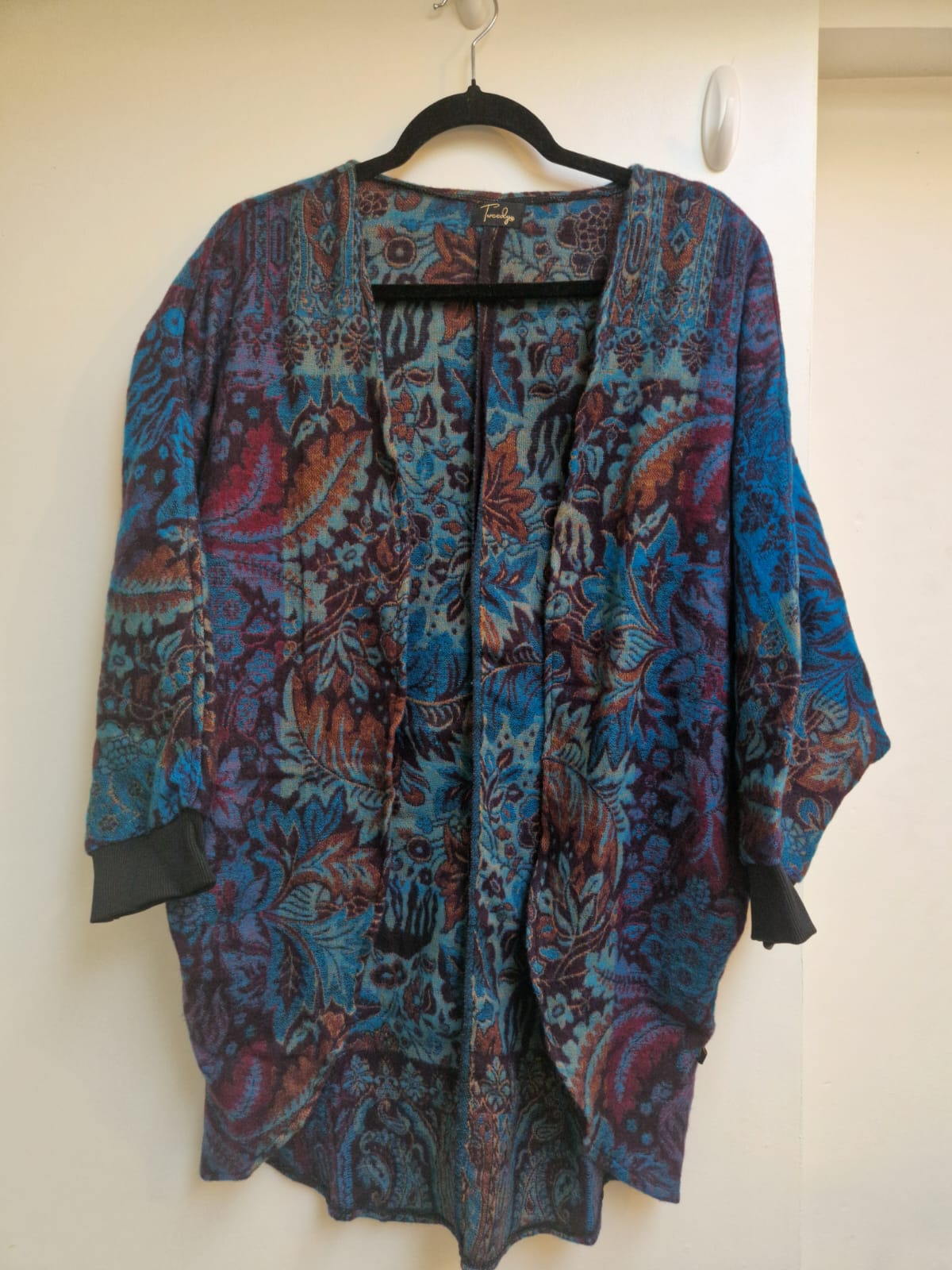 What a beautiful cardigans. I have 2 of these amazing cardigans and gifted 2 for Christmas to my daughter who had wanted one for ages but couldn’t decide on the colours. Thankfully I knew what she wanted an amazingly I bought the last one! She was so happy on Christmas Day. These cardigans are so comfortable and warm to wear I wouldn’t be without them. They are colourful without being garish, comfortable and yet dressy, very reasonably priced and best of all no animal was used in the making of it. I wear mine all the time I love them so much!